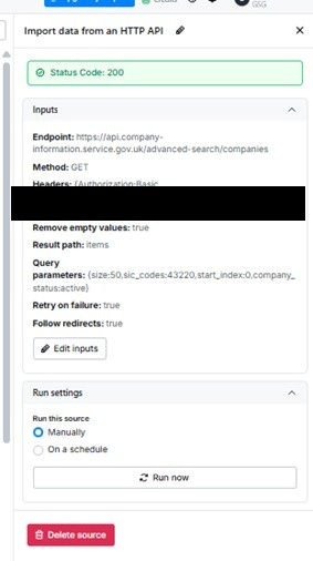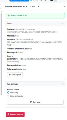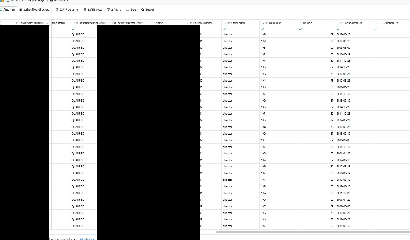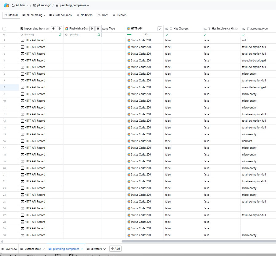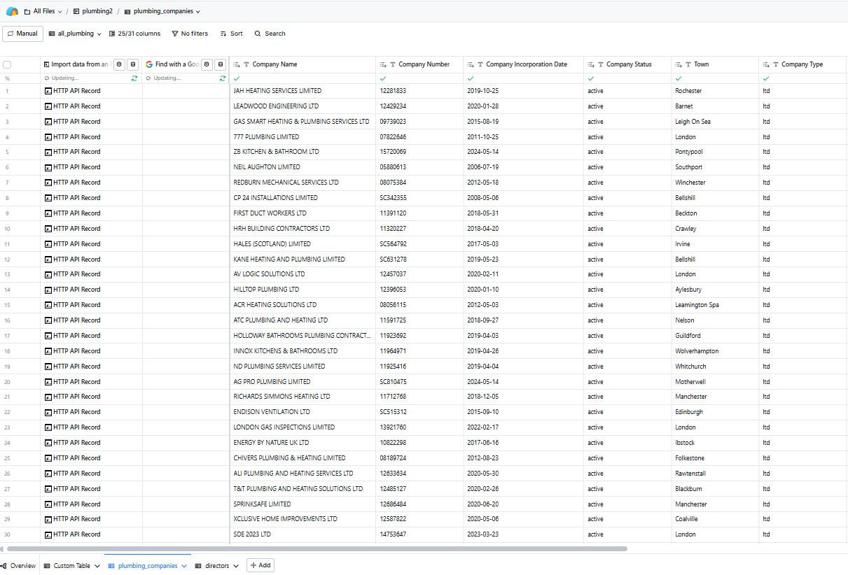 Returns a filtered list of companies by SIC code, status, and structure. This is the starting point to populate my dataset with a list of “active” UK plumbing companies from which everything else flows.