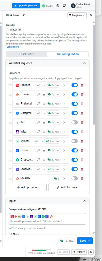 On the directors table, I run a work email waterfall. Clay tries each provider in sequence and stops on the first hit. No single provider has complete coverage of the UK SME market - chaining multiple sources increases the overall hit rate while only charging for providers actually queried.