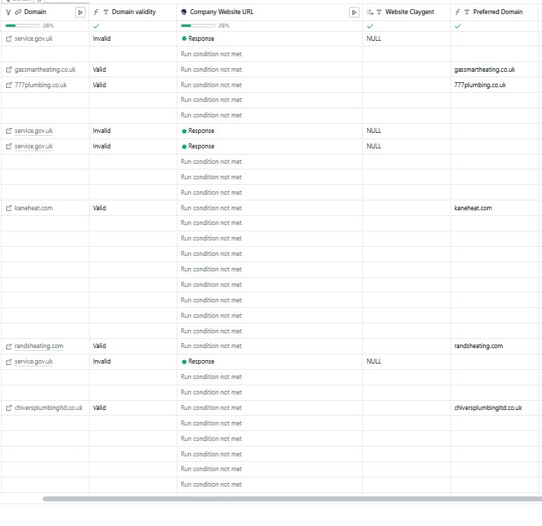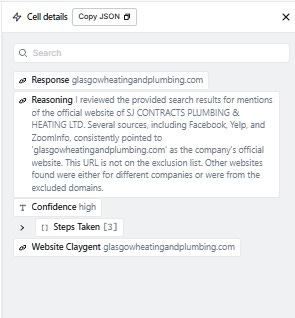 Before running any contact enrichment, I need each company’s website domain. The reason is practical: email finding tools work significantly better when you give them a domain to search against. Asking “find me an email for John Smith at chiversplumbing.co.uk” returns far higher match rates than asking for “John Smith at Chivers Plumbing” - the domain acts as a lookup key.