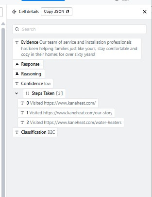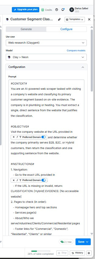 Once I have a verified domain, Claygent visits each company website in web browsing mode and classifies the business as B2B, B2C, or Hybrid. This only runs on rows where Preferred Domain is not blank.