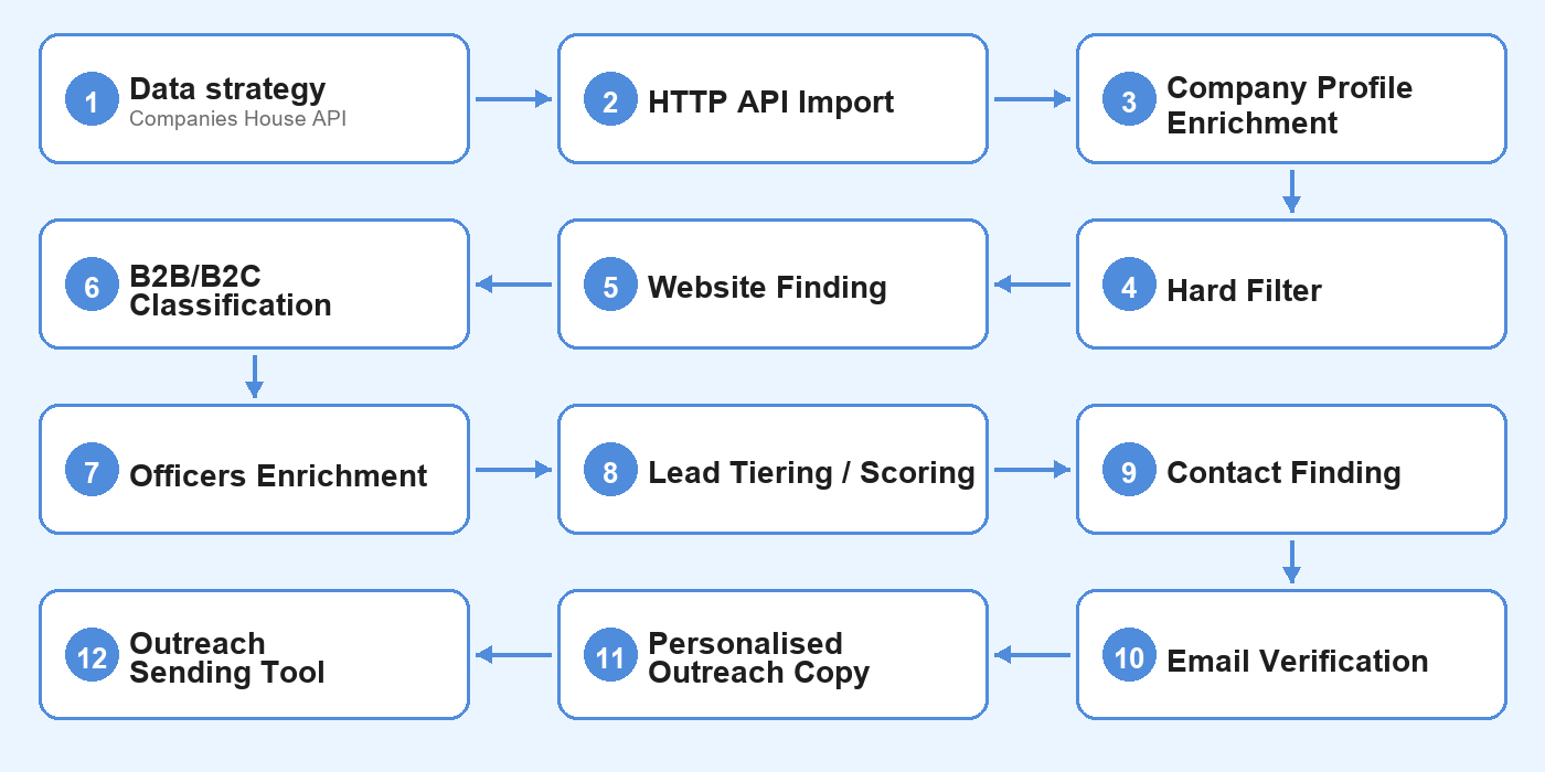 First, I needed to work out my data strategy. Thankfully, the Companies House API is excellent. It’s the UK’s public company registry - every limited company files here: incorporation date, director details, accounts type, charges, insolvency history. All publicly accessible via API, and all free.