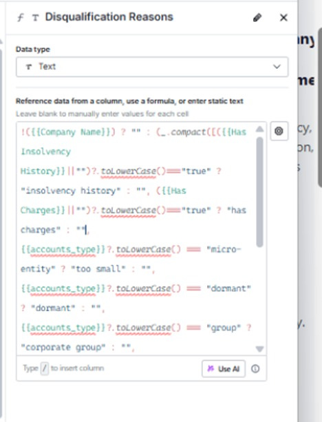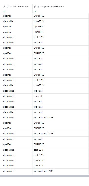 qualification_status- outputs “qualified” or “disqualified” as a clean labelDisqualification Reasons- outputs a human-readable reason for each eliminated row (too small, post-2015, dormant, etc.)