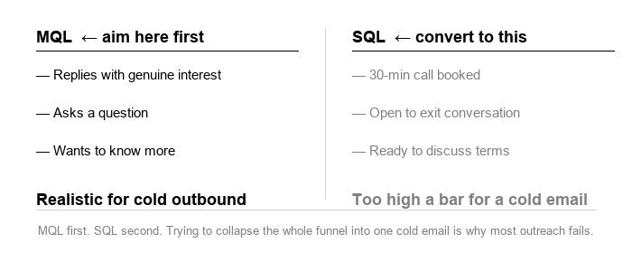 An MQL - someone who replies with genuine interest, asks a question, wants to know more - is a more realistic first objective for cold outbound.