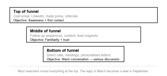 Most searchers invest everything at the top and have nothing for the middle or bottom. The owner who replies in March might be ready to talk seriously in September - but only if there’s been consistent, credible contact in the interim. The pipeline should manage the relationship until the owner is ready, not just generate first touches.
