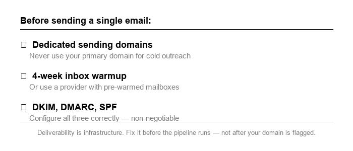 Buy dedicated domains for cold outreach. Warm the inboxes for at least four weeks before sending. Configure DKIM, DMARC, and SPF records correctly. Deliverability is all about the infrastructure.