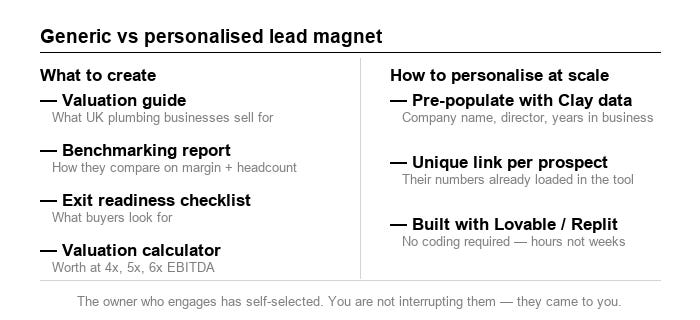 Instead of sending every prospect the same guide, you generate a personalised version for each company, pre-populated with their data from Clay. Or build a hosted tool and send each prospect a unique link with their business already loaded. They click and see their own numbers.