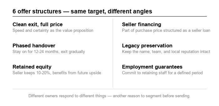 “I want to buy your business” is one offer, but it might not be the most compelling. The message needs to communicate a specific value proposition.