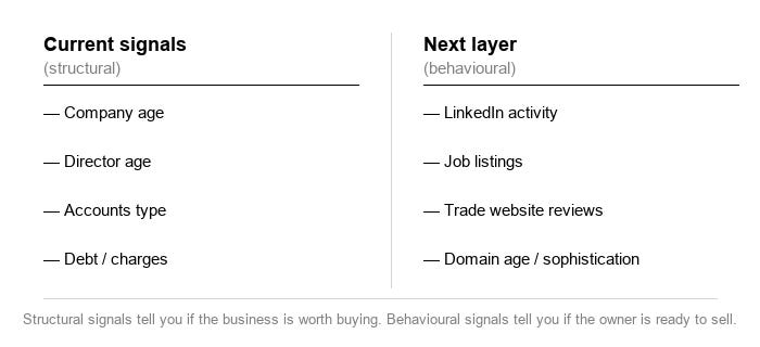 The current signals used are good - company age, director age, accounts type, debt. The next layer would to layer behavioural data to enrich the “officer” data: