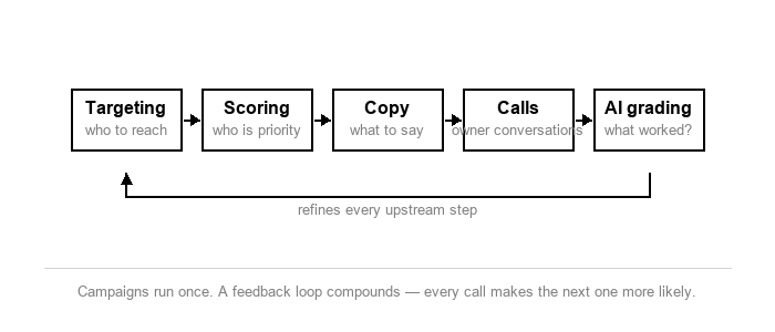 Once one is getting calls with business owners, the next step would be to introduce an AI layer that grades each conversation - which framing generated engagement, which questions triggered openness about exit, which objections came up repeatedly. That analysis feeds back into every upstream step. Better call data refines the copy. Better copy refines the scoring. Better scoring refines the targeting.