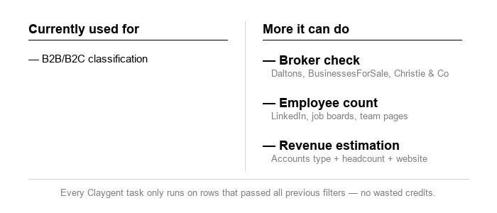 I used Claygent for B2B/B2C classification. There’s more it can do:
