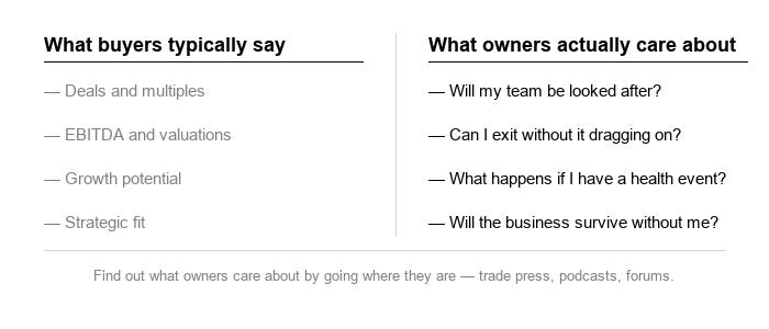 The acquisition equivalent: don’t approach a business owner talking about deals and multiples. Approach them talking about the problem they’re sitting with.