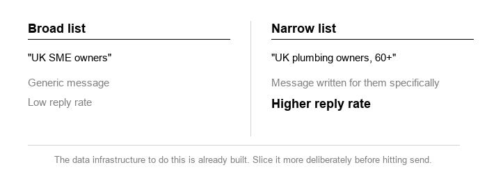 The best-performing outreach campaigns have gotten more specific over time. A message written for “UK plumbing company owners aged 60+” will always outperform one written for “UK SME owners.” Tighter segmentation produces better message-to-market fit — and better message-to-market fit is what drives reply rates.