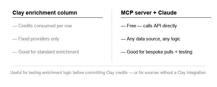One underexplored option: Model Context Protocol (MCP) servers as an alternative to Clay enrichment columns for certain data pulls.
