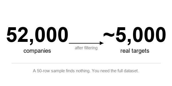 52,000 companies sounds like a lot. After filtering, the real target universe is ~5,000. But you can’t find the “needle"“ without pulling the “full haystack” - the 50-row free tier sample isn’t sufficient to build the real pipeline.